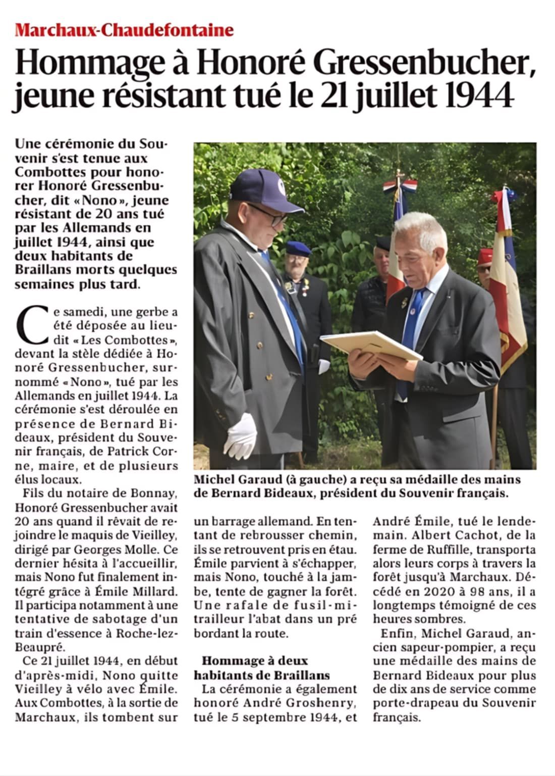 Belle cérémonie du souvenir au lieu dit les Combottes à Marchaux Chaudefontaine en mémoire d'Honoré Gressenbucher dit Nono résistant tué âchement par les allemands en juillet 1944 à l'âge de 20 ans. Avec la participation du souvenir français, des scouts de France, du président des anciens combattants Fabrice SEGARD ainsi que Gérard PIGUET représentant de l'union nationale des parachutistes. Voir l'article de l'Est Républicain |
